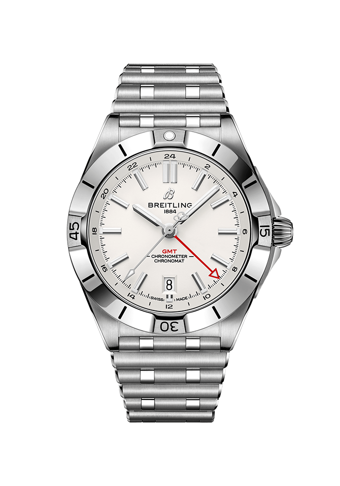 Die Chronomat Automatic GMT 40 ist Breitlings Verbeugung vor der Weltreise – nicht nur dank des Zifferblatts, das zwei Zeitzonen anzeigt, sondern auch dank ihrer legeren Ästhetik. Das dezente Zusammenspiel von Zifferblättern sowie Gehäusen und Armbändern aus Edelstahl passt zu jeder Garderobe. Zugleich unterstreicht die Ton in Ton gehaltene 24-Stunden-Skala den roten GMT-Zeiger. Angetrieben wird die GMT-Komplikation vom Breitling-Kaliber 32. Dank der 24-Stunden-Skala kann der Nutzer eine zweite Zeitzone mitverfolgen und weiss auf Anhieb, ob es dort Tag oder Nacht ist, während die «Zwiebelkrone» (ein klassisches Merkmal der Chronomat, das seinen Namen der geriffelten Kuppelform verdankt) einfache Einstellungen ermöglicht. Als Allzweck-Sportuhr ist die GMT 40 in allen Universen von Breitling zu Hause – zu Land, zu Wasser und in der Luft – und punktet mit einer beeindruckenden Wasserdichtigkeit bis 200 m. Die Mission der Chronomat, «eine Uhr für alle Zwecke» zu sein, ist dank der praktischen Grösse und des dezenten Stils der GMT 40 heute mehr denn je Realität. Robust genug fürs Fitnesscenter, doch auch mit der nötigen Eleganz für den Abendanzug – wenn es je eine Uhr zum Reisen gab, dann ist es diese.