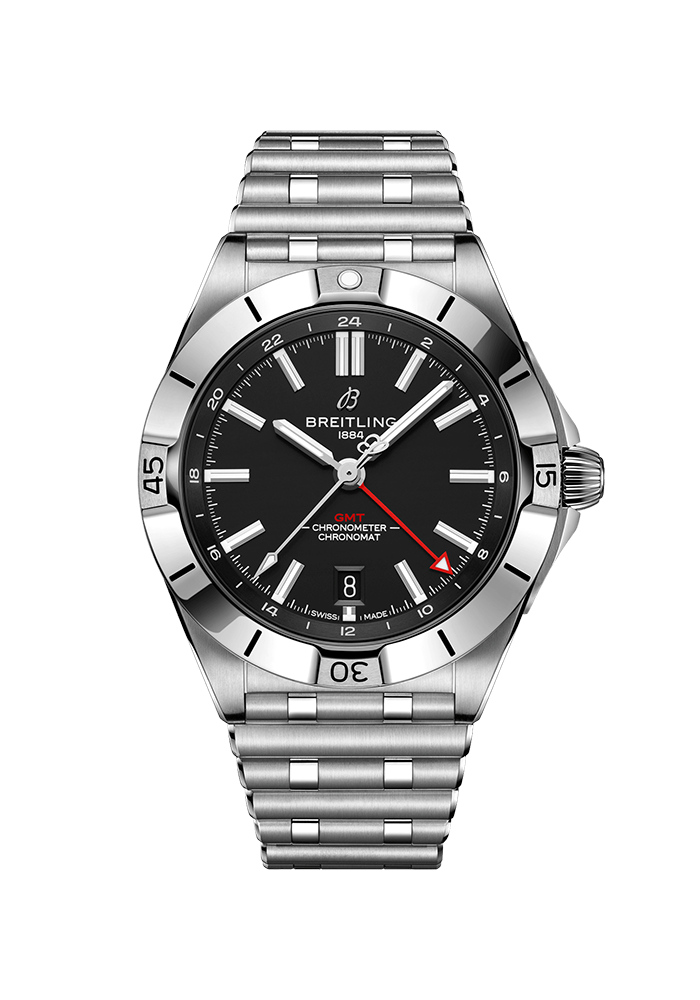Die Chronomat Automatic GMT 40 ist Breitlings Verbeugung vor der Weltreise – nicht nur dank des Zifferblatts, das zwei Zeitzonen anzeigt, sondern auch dank ihrer legeren Ästhetik. Das dezente Zusammenspiel von Zifferblättern sowie Gehäusen und Armbändern aus Edelstahl passt zu jeder Garderobe. Zugleich unterstreicht die Ton in Ton gehaltene 24-Stunden-Skala den roten GMT-Zeiger. Angetrieben wird die GMT-Komplikation vom Breitling-Kaliber 32. Dank der 24-Stunden-Skala kann der Nutzer eine zweite Zeitzone mitverfolgen und weiss auf Anhieb, ob es dort Tag oder Nacht ist, während die «Zwiebelkrone» (ein klassisches Merkmal der Chronomat, das seinen Namen der geriffelten Kuppelform verdankt) einfache Einstellungen ermöglicht. Als Allzweck-Sportuhr ist die GMT 40 in allen Universen von Breitling zu Hause – zu Land, zu Wasser und in der Luft – und punktet mit einer beeindruckenden Wasserdichtigkeit bis 200 m. Die Mission der Chronomat, «eine Uhr für alle Zwecke» zu sein, ist dank der praktischen Grösse und des dezenten Stils der GMT 40 heute mehr denn je Realität. Robust genug fürs Fitnesscenter, doch auch mit der nötigen Eleganz für den Abendanzug – wenn es je eine Uhr zum Reisen gab, dann ist es diese.