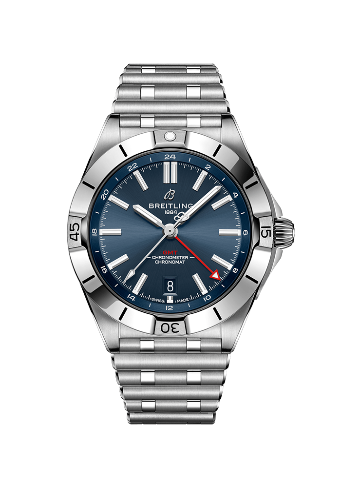 Die Chronomat Automatic GMT 40 ist Breitlings Verbeugung vor der Weltreise – nicht nur dank des Zifferblatts, das zwei Zeitzonen anzeigt, sondern auch dank ihrer legeren Ästhetik. Das dezente Zusammenspiel von Zifferblättern sowie Gehäusen und Armbändern aus Edelstahl passt zu jeder Garderobe. Zugleich unterstreicht die Ton in Ton gehaltene 24-Stunden-Skala den roten GMT-Zeiger. Angetrieben wird die GMT-Komplikation vom Breitling-Kaliber 32. Dank der 24-Stunden-Skala kann der Nutzer eine zweite Zeitzone mitverfolgen und weiss auf Anhieb, ob es dort Tag oder Nacht ist, während die «Zwiebelkrone» (ein klassisches Merkmal der Chronomat, das seinen Namen der geriffelten Kuppelform verdankt) einfache Einstellungen ermöglicht. Als Allzweck-Sportuhr ist die GMT 40 in allen Universen von Breitling zu Hause – zu Land, zu Wasser und in der Luft – und punktet mit einer beeindruckenden Wasserdichtigkeit bis 200 m. Die Mission der Chronomat, «eine Uhr für alle Zwecke» zu sein, ist dank der praktischen Grösse und des dezenten Stils der GMT 40 heute mehr denn je Realität. Robust genug fürs Fitnesscenter, doch auch mit der nötigen Eleganz für den Abendanzug – wenn es je eine Uhr zum Reisen gab, dann ist es diese.
